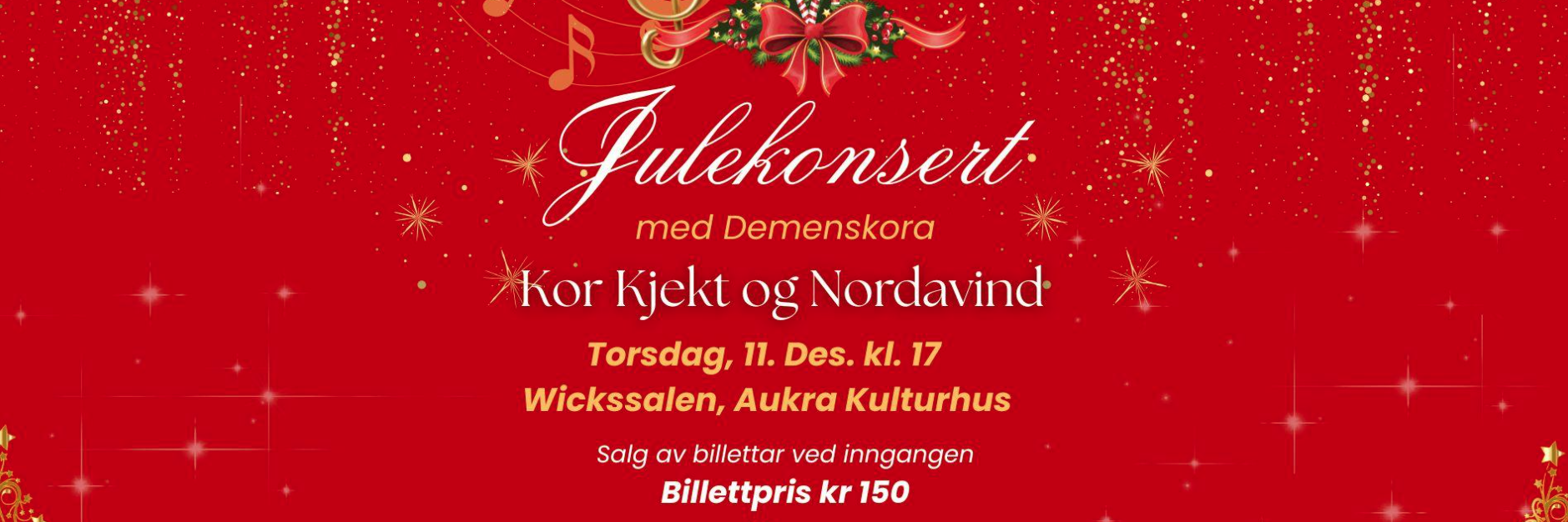 Onsdag 5. november møtte dei to demenskora Kor Kjekt og Nordavind for første gong i Wicksalen på Aukra kulturhus. Og det var både kjekt og trøkk då over 50 glade songarar løfta eit variert repertoar til nye høgder. Formålet var å øve til felles julekonsert. Nesten to timar var over i ein fei, og tilbake set vi att med minna om kor sterkt og flott det var å vere med på dette. Vi gleder oss til å få dele dette med alle som kjem på konserten i desember.