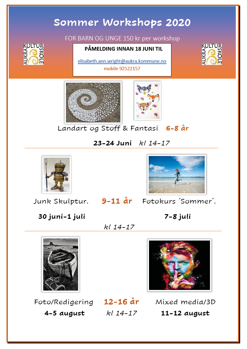 Sommer-workshop for barn og ungeVelkommen til Sommarworkshop på kulturskolen 😎 🔹 6-8 år: Landart og Stoff & Fantasi 23-24. juni 🔸 9-11 år: Junk Skulptur 30. juni-1. juli 🔸 9-11 år: Fotokurs ´Sommer´ 7-8. juli 🔹 12-16 år: Foto/Redigering 4-5. august 🔹 12-16 år: Mixed media/3D 11-12. august PÅMELDING INNAN 18. JUNI TIL: elisabeth.ann.wright@aukra.kommune.no / mobil 92522157 Sist endra 16.06.2020 18.12